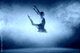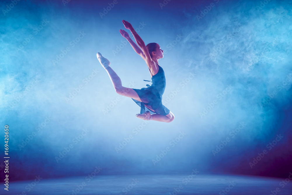 Beautiful young ballet dancer jumping on a lilac background.