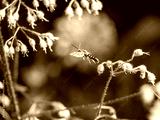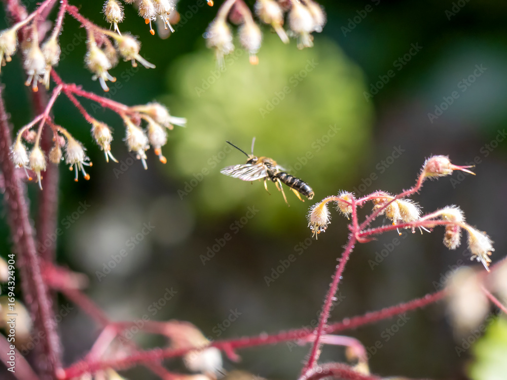A common sweat bee (Lasioglossum calceatum), also known as a furrow bee, flying between purple bellflowers.
