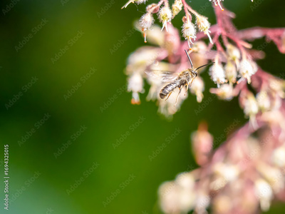 A common sweat bee (Lasioglossum calceatum), also known as a furrow bee, flying between purple bellflowers.