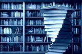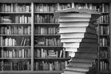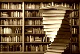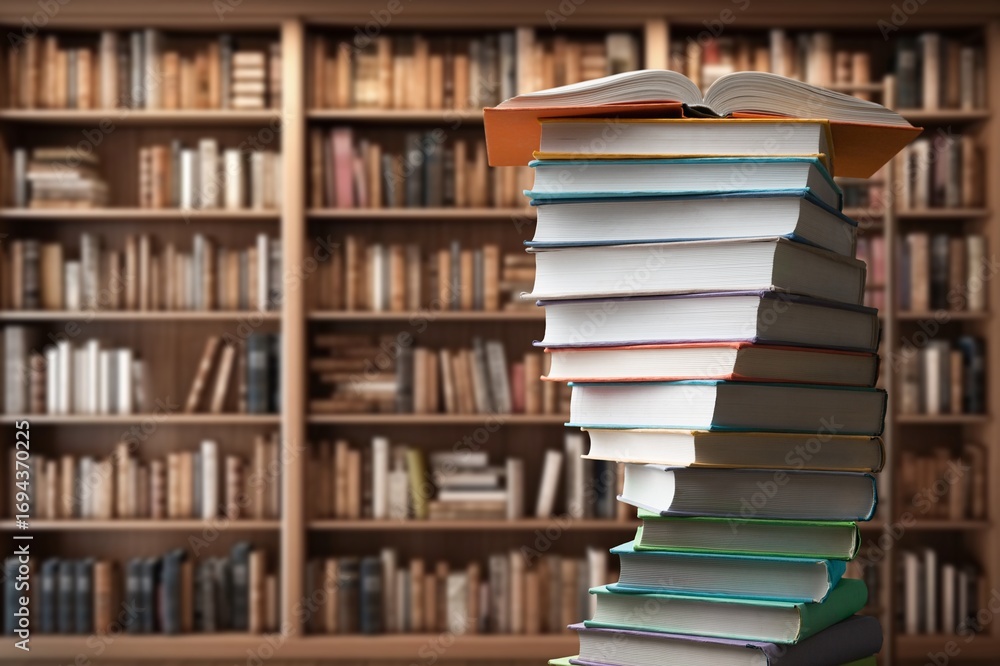 stack of reading books on desk in library