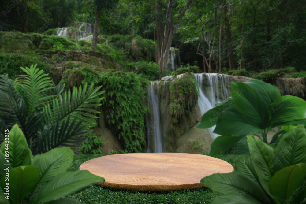 wood plate table top podium with outdoor waterfall tropical forest nature background landscape.Natural water mineral product present placement pedestal wooden stand display.jungle paradise concept.
