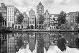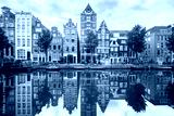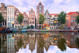 Amsterdam canal Herengracht with typical dutch houses and their reflections during morning blue hour, Holland, Netherlands.