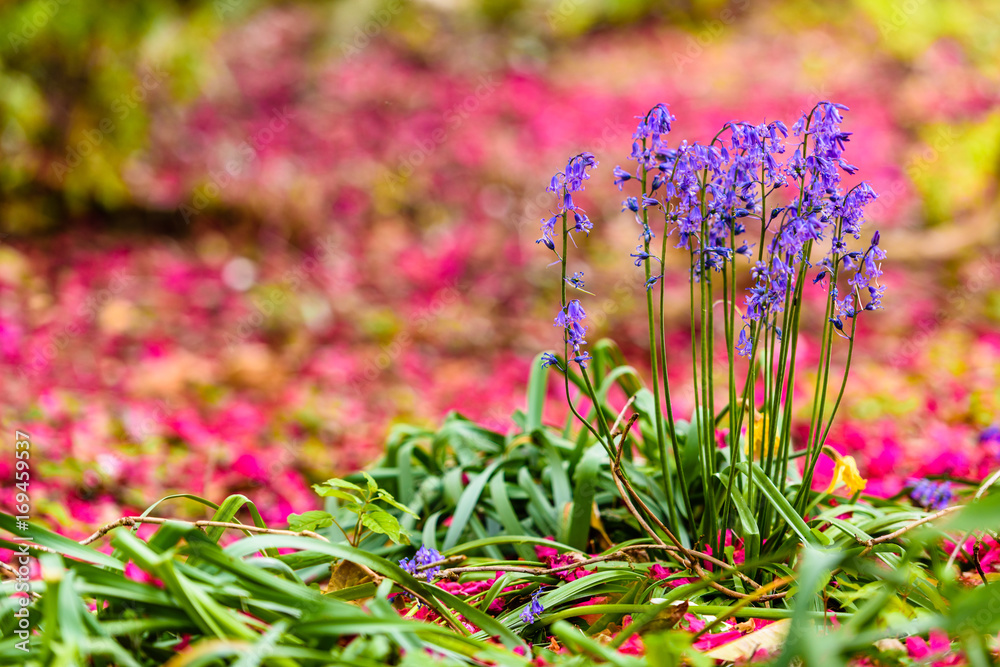 Pink rhododendron petals lie on the ground around Bluebells growing in a forest.