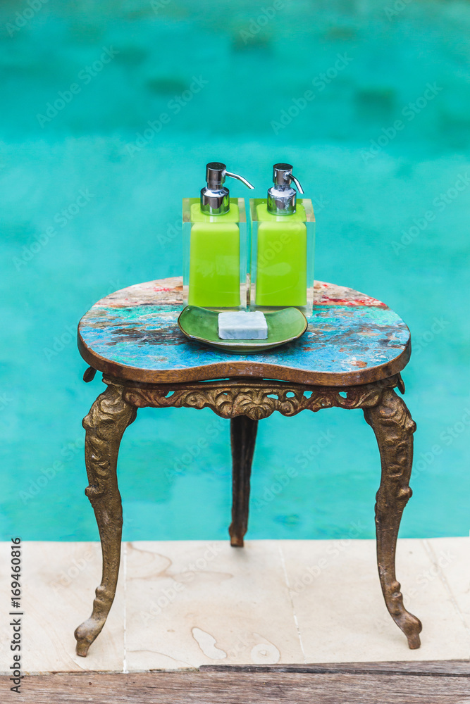 Shower and spa kit in luxury hotel: shampoo, lotion, handmade organic soap, two rolled towels in wicker basket near private pool