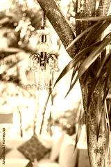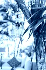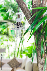 Old glass vintage chandelier hanging in garden outdoor. Unusual decoration in Bali luxury outdoor style