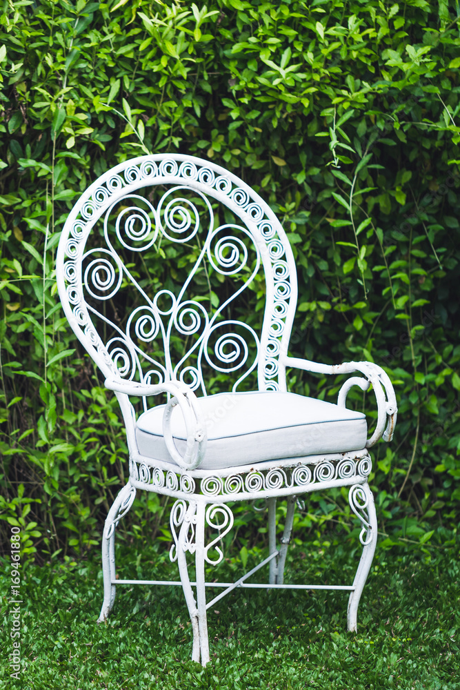 Old vintage furniture in garden with natural green background. White metal chair and table, old-fashioned european style