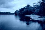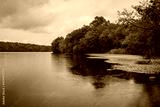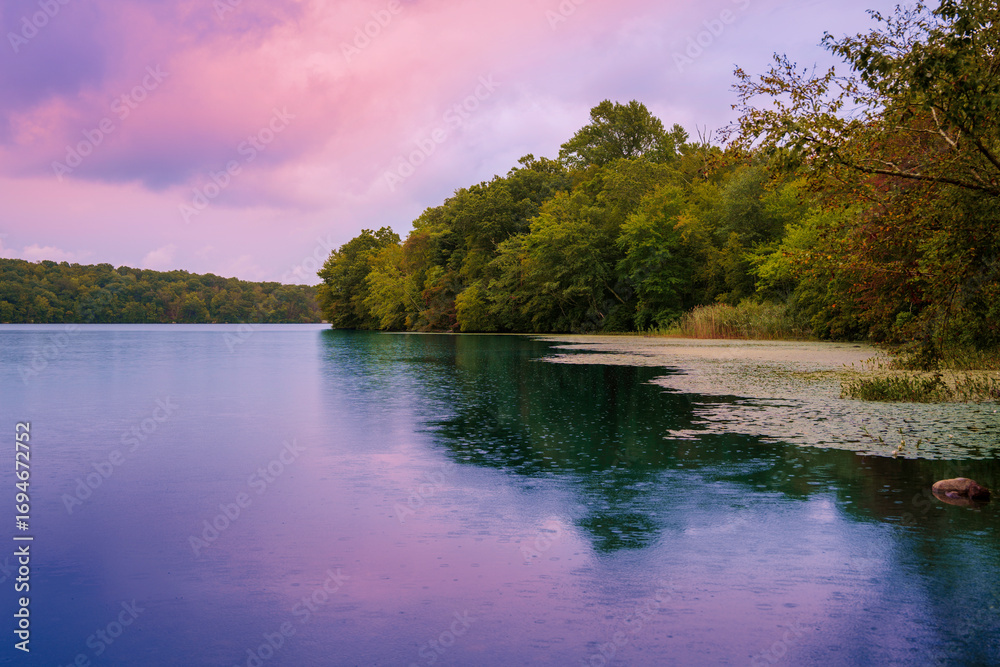 Stormy New England lakeshore landscape in autumn on a rainy day, with purple clouds rolling