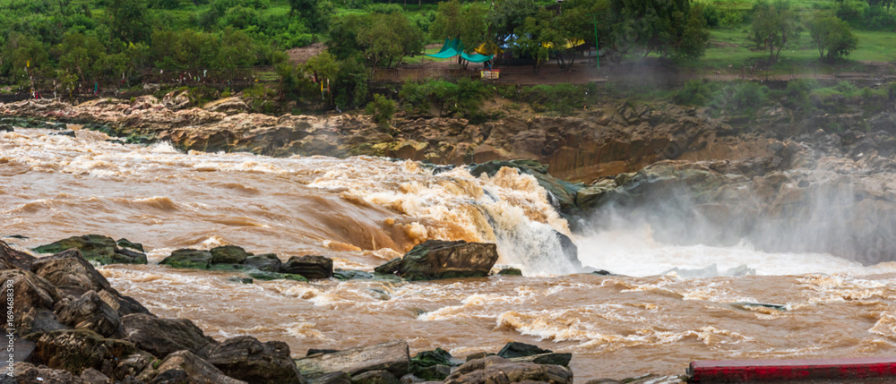 Dhuandhar waterfall along rocky terrain on Narmada river has been named sappearance of the water falling off the cliff with utmost force at Jabalpur, Madhya Pradesh, India.