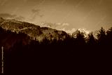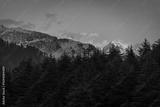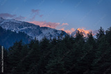 Panoramic landscape of Himalayas mountain range during a spring sunset from Manali which is a popular tourist destination in Himachal Pradesh, India.