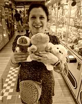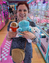 A smiling woman holds plush toys in an arcade after winning claw machines. Joyful lifestyle, leisure, and playful emotion combining entertainment with personal happiness.