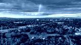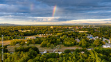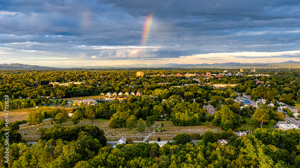 Queensbury, NY, USA - August 27, 2025: Late afternoon aerial view of a rainbow over the Queensbury / Glens Falls area near the southern boundary of the Adirondack Park of of Interstate 87.
