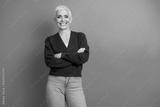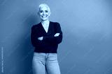 Senior woman with arms crossed smiling confidently against a vibrant blue background, embodying charm and happiness