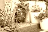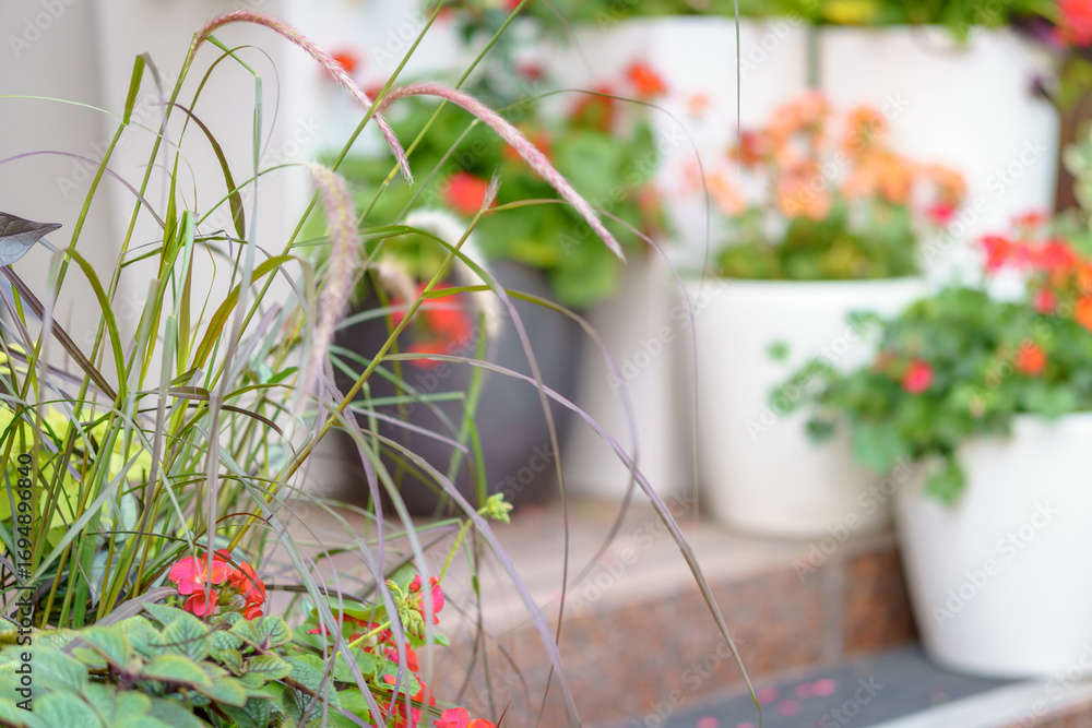 A variety of potted plants arranged on steps form a vibrant and lively composition. The contrast of textures and colors highlights the decorative appeal of the entrance area.