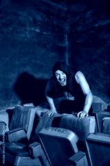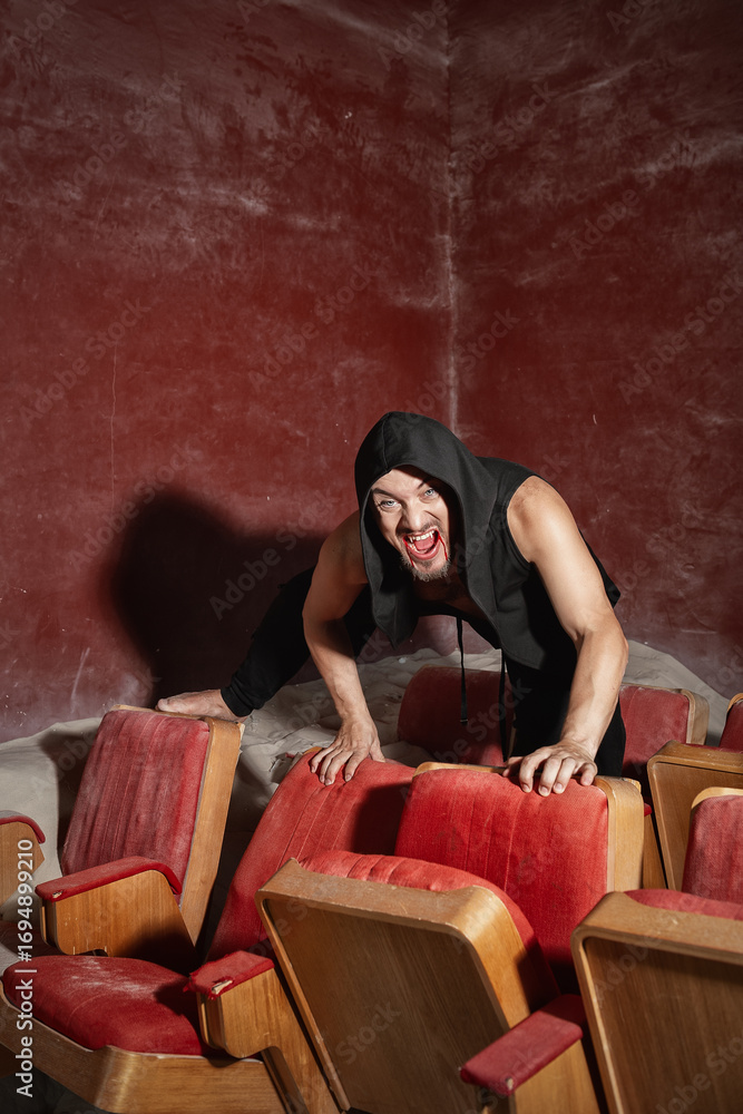 Modern man vampire with drops of blood on his lips screaming in old movie theater