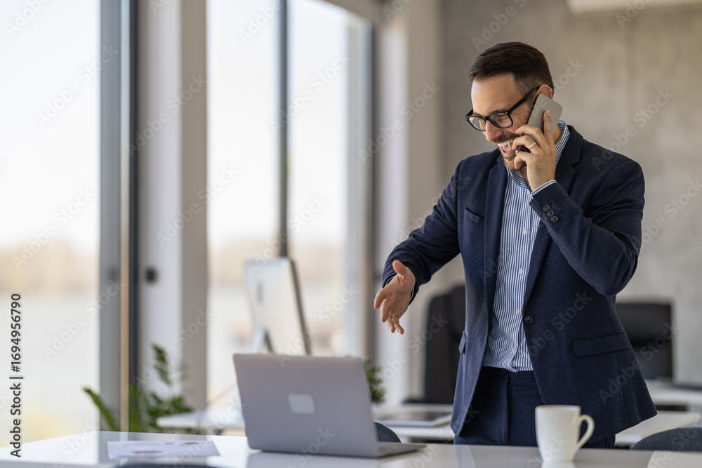 Businessman talks on phone while presenting ideas in modern office with laptop