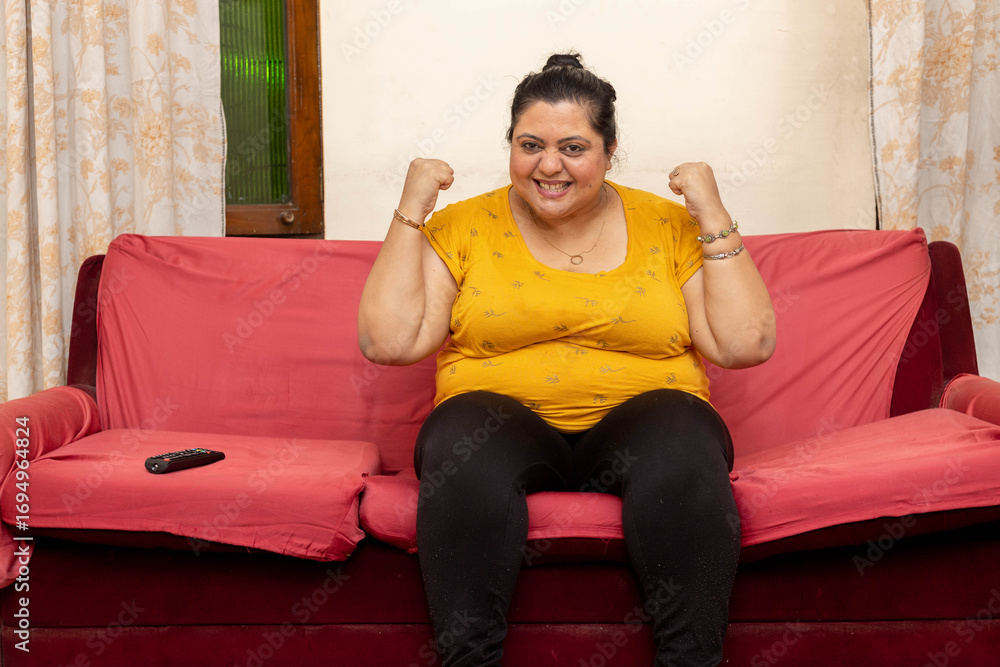 Confident excited plus size Indian woman at home