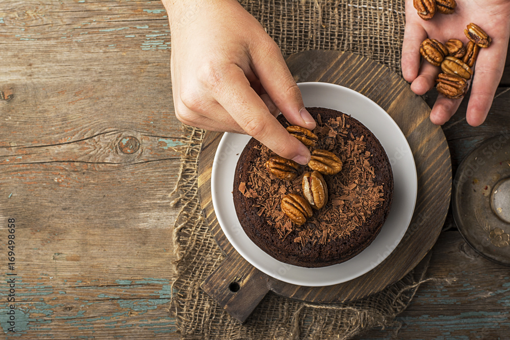 Male hands decorate the pecan nuts with a homemade chocolate crazier cake on a plain gray wooden background for a cozy home autumn tea party. Top View.