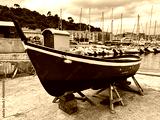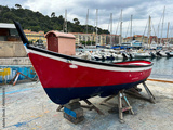 View on red boat under repair on a summer day. Close-up. Nice. France.
