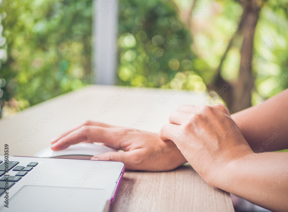 Closeup woman holding her painful hand from using computer. Office syndrome hand pain by occupational disease.