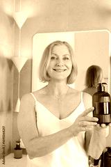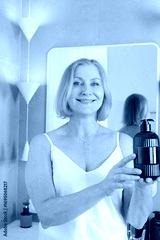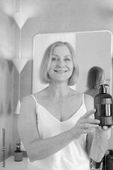 A woman is gracefully holding an essential oil bottle in a beautifully elegant, serene setting