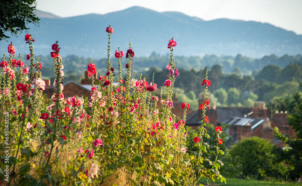 Wild summer flowers,at Fort Royal Park,Worcester,looking west to the Malvern Hills,Worcestershire,UK.
