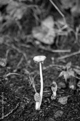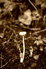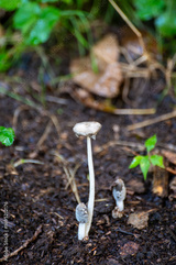 Various mushrooms grow on damp wood or logs or soil along a mossy stream in a ravine.