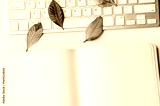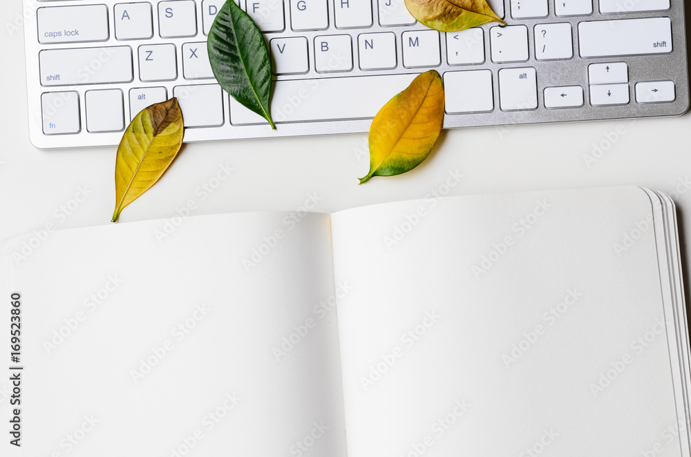 Autumn workplace with fallen leaves, keyboard and notebook, view from above
