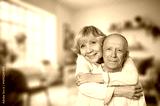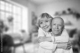Senior happy couple hugging in home together,