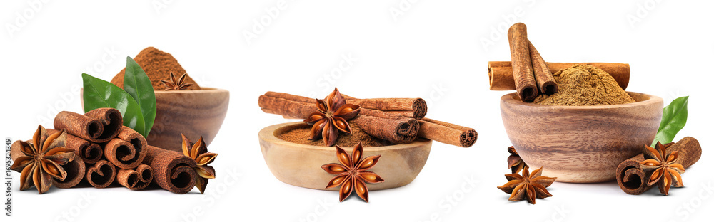 Cinnamon sticks and powder isolated on white, set