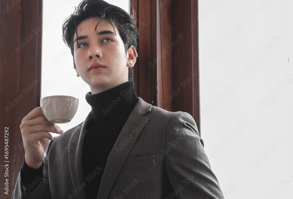 Young man in suit holding coffee cup near window in elegant space