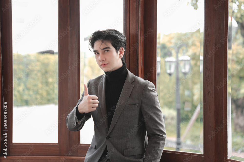 Stylish Young Man Giving Thumbs Up in Elegant Interior Setting