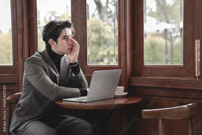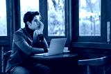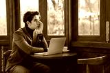 Thoughtful Young Man Working Alone in Cozy Cafe with Laptop