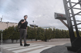 Confident Business Person Walking Along Urban Sidewalk under Cloudy Sky
