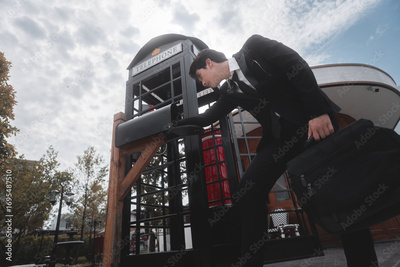 Businessman Using Vintage Phone Booth in Urban Setting Outdoors