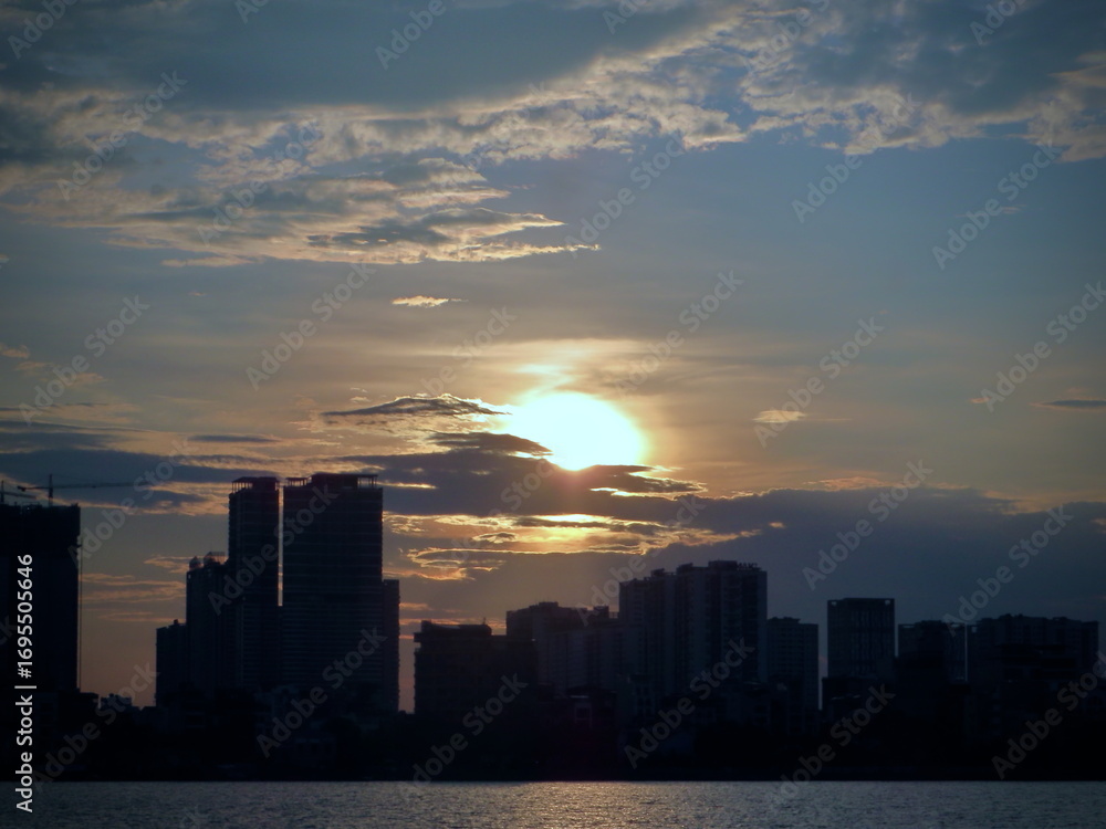 Cool Blue Dusk at West Lake, Hanoi – Sun Breaking Through Clouds over Modern Skyline
