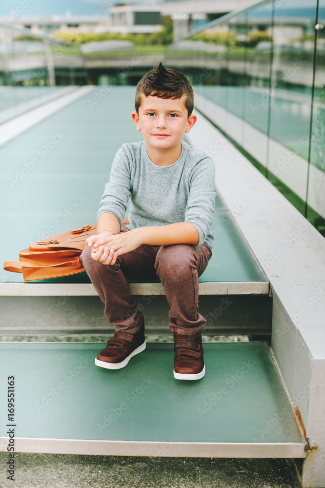 Outdoor portrait of happy young kid boy. Fashion schoolboy resting outside. Back to school concept