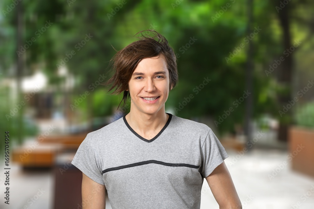 Headshot portrait of young handsome guy outdoors