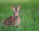 Cottontail bunny rabbit munching grass in summer garden. Natural green background with copy space.