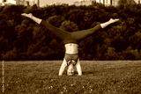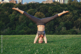 Young beautiful Caucasian woman doing headstand yoga pose. Yogi woman doing stretching workout in park outdoors at sunset. Healthy lifestyle modern activity