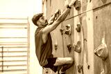 Determined male athlete climbing challenging indoor rock wall