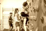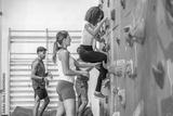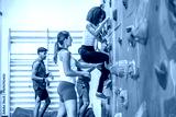 Determined climber ascending colorful climbing wall in gym with instructor supporting