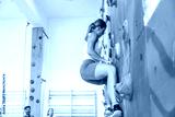 Determined female athlete climbing challenging indoor rock wall in gym