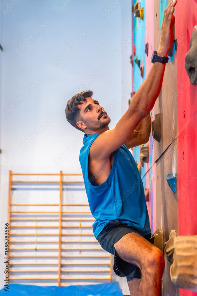 Determined male athlete climbing challenging artificial rock wall in indoor gym