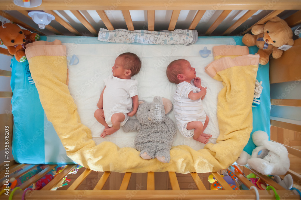Two adorable newborns lie side by side in a cozy crib surrounded by soft toys and bright blankets. The setting is warm and inviting, perfect for nurturing rest.