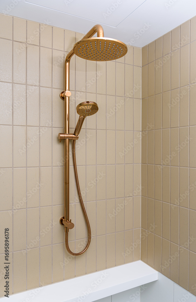 Luxury Rose Gold Shower Head and Handheld Shower on Tiled Wall