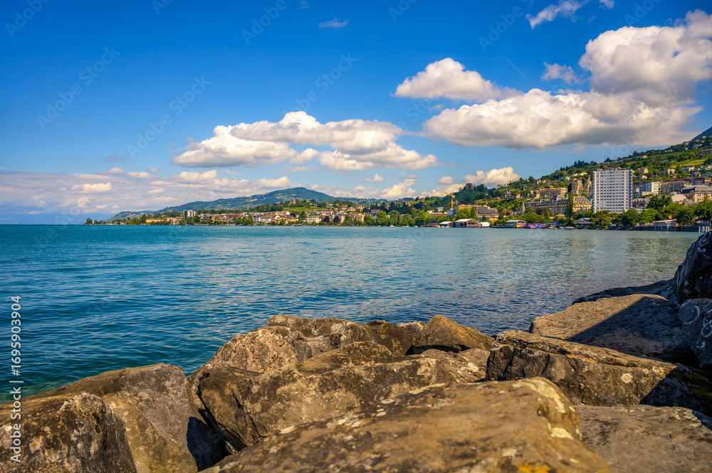 Montreux, Switzerland, with hillside buildings and Lake Geneva. Montreux is located in the centre of a region named the Vaud or Swiss Riviera.