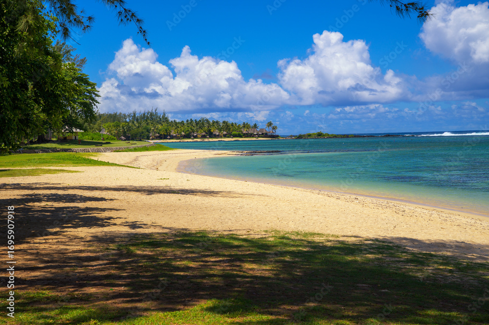 Clear turquoise water and white sandy shoreline at St. Felix Public Beach in southern Mauritius.