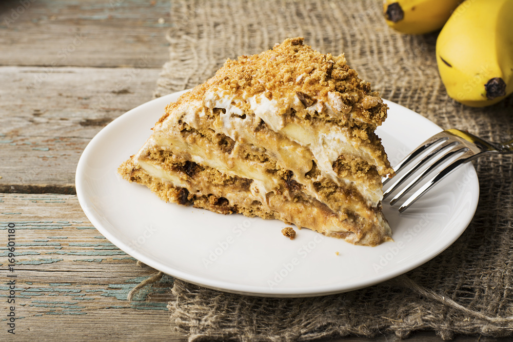 Fresh homemade banana puff cake with biscuit, sour cream, banana slices, honey on a plain gray wooden background in horizontal design. A bunch of bananas in the background.