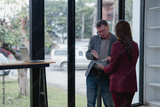 Business colleagues using tablet and discussing in modern office, with a laptop on a desk in the foreground and a street view in the background