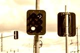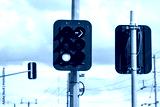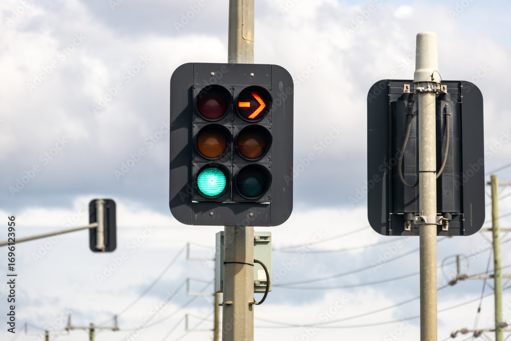 A traffic light in Melbourne Australia showing a green signal and red right-turn arrow, used to manage vehicle flow and road safety at intersections. Concept of traffic control, urban infrastructure